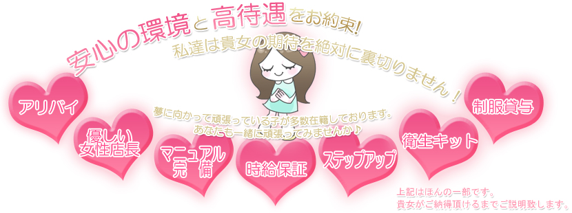![]() 当グループでは、一番に貴女の事を考えた待遇整備を既に進めています。 さらに、日々働いている女性から出てくる改善点・意見を100%吸収して、 万全の環境作りを追求しておりますのでご安心下さい。 給与は全額日払いその日働いたお給料は、お帰りの際に精算して、全額現金で支給いたします。 出勤シフトは完全自由週に一回でも月に一回でも構いません。 完全自由出勤制です。 もちろん生理休暇もあります。アリバイ会社あります。 当店は、関連会社としてに『人材派遣会社』『広告代理店』『IT関係』『キャバクラ』等があり、 アリバイをどんな職種でも対応できますので、どうぞご安心ください。 指名ボーナス有常のお給料とは別に、お客様から指名されるごとに指名料がアップします! 体験入店大歓迎です!実際に数時間だけ働いてみて、これから入店するかどうかの判断材料にして頂けます。 納得していただければ、そのまま入店できます。 逆に納得いただけない場合は、入店しないという選択もできます。 罰金、ノルマ一切無し! ちょっとの遅刻などで罰金をとったり、仕事にノルマを課すお店も少なくありません。 当店は、そういったペナルティ等は一切ございませんのでご安心ください。 働いたら働いただけのお給料を、キッチリ受け取って帰るのは当然です! 提携医療法人あります! 店と提携している医療機関があり、月一回の検診を実施しております。 マンション寮は各地に完備しております。 電化製品・家財道具等の各設備や備品一式を準備しておりますので、面接~入店後、当日でも即入居も可能!